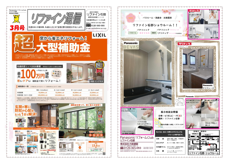 2026年03月16日 【最大100万円の超大型補助金!】 【最大100万円の超大型補助金!】 冬の寒さや夏の暑さにお悩みではありませんか? 「先進的窓リノベ2026事業」を活用すれば、窓やドアの省エネリフォームが今だけ大変お得です! LIXILの人気内窓「インプラス」などを設置することで、一戸あたり最大100万円の補助金が受け取れます。 光熱費の節約と、一年中快適な住まいづくりを実現する大チャンス。補助金を使って賢くリフォームしませんか? まずはお気軽にご相談ください!